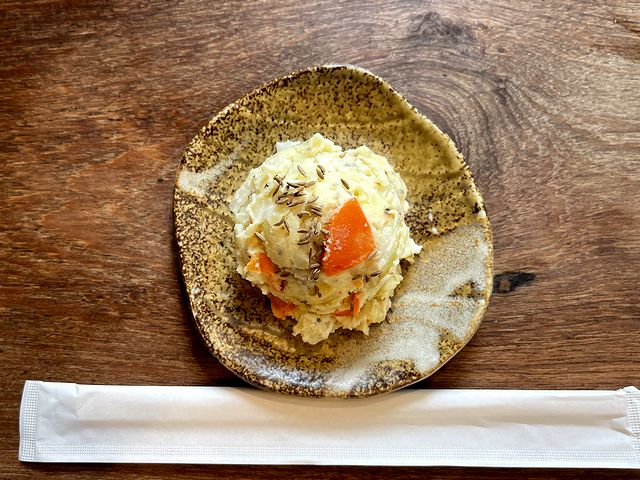 それとスパイシーポテサラは、以前いただいたことがあるポテトサラダと同様、上に載った種様のスパイスの風味が、何とも良い感じにマッチ。ところでこのスパイス、クミン?ディル?フェンネル?っていうか、ホールの状態では似ているのが多いにもかかわらず同定できるほど使ったことがないので、「これ!」と言い切れないのがモヤっとするのですが、とにかく、このスパイスが効いていることによって、凡百のポテトサラダから一線を画している、と。
