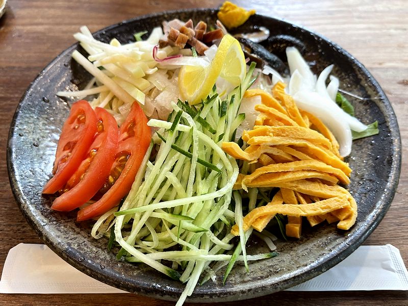 以前いただいた時(と、お品書きの写真で)は、肉っ気担当が蒸し鶏だったのですが、今日のはチャーシューの細切りで、またそれよりも特徴的に感じるのは、お店の農園で取れたと思われる生野菜類。一般的なキュウリやトマトの他、タマネギや大根っぽいもの、サニーレタスっぽい葉っぱなどなど、何種類も載っています。