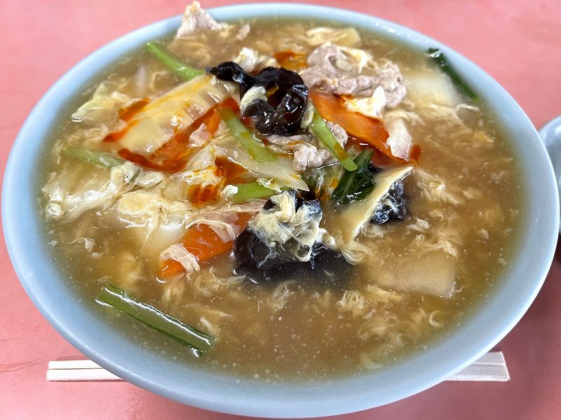 そして具は、豚肉、白菜、ネギ、人参、タケノコ、キクラゲ、フワフワの溶き卵などがたっぷりと。どれも火の通し加減は絶妙で、更にこれらの旨味がスープに溶け込むことによって、また味わいを一層高めています。