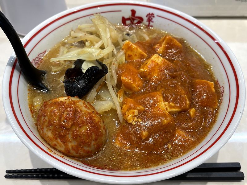 で、まずは、上に掛かった辛し麻婆、いわゆる蒙古麻婆をあえて混ぜないでスープからいってみたところ、野菜がメインとも言われている不思議な旨味のある出汁に、具材の野菜や豚肉から出た旨味、まろやかな特製味噌、ほんの少しだけ効いている唐辛子が一体となって、これが。