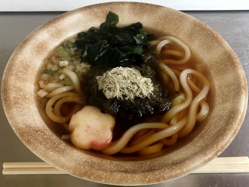 それで3回目となる今回は、こちらでは初めてのうどんということで、とろろ昆布うどんをオーダー。出来上がりを受け取っていざ実食しようにも、雨は降り続いているし、サーキットのフリースペースに置いてあるテーブルには屋根がなく困っていたところ、こちらのお店の軒下で食べさせていただけることになりました。