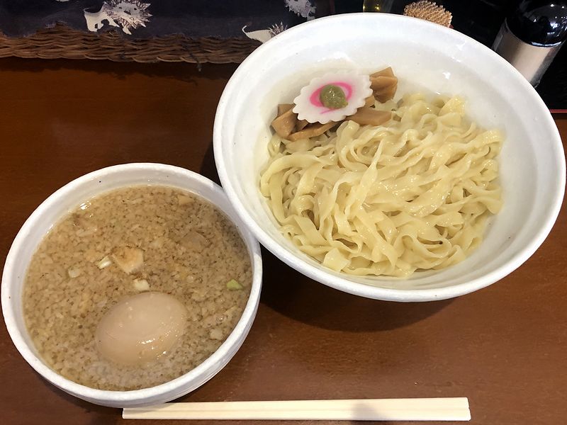 そしてその麺を浸けるつけ汁は、煮干出汁と背脂、そこに醤油がガツンと効いたスパルタンなもの。タマネギの辛味・甘味・シャクシャク感がとても合っていますし、断面積がかなり広い麺にしっかりと味をのせてくれる味の濃さが良いです。