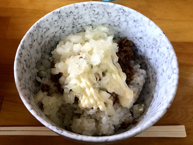 ただ、中身の方は健在というか、チョイ辛の肉味噌、生のタマネギ、マヨネーズという組み合わせは記憶にあるとおり。個人的に、丼物のマヨネーズは味が持ってかれるので積極的には推せないんですけど、これは量が丁度良く、タマネギのおかげか一体感があるのが良いですね。