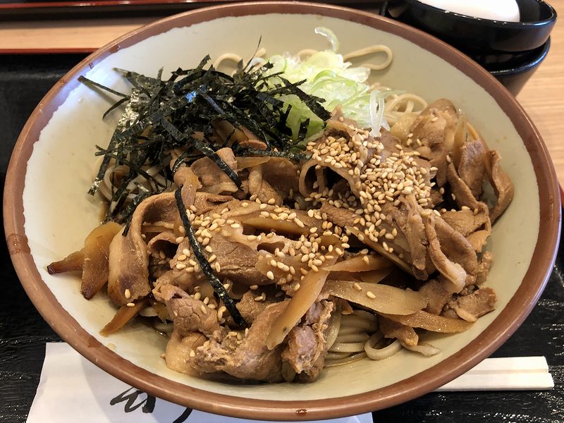 更に、上に載せられた、白ネギ、海苔、煎りゴマといった薬味も効いていますね。特に炒りゴマは、その香ばしさがアクセントとなっていて、更にそれが肉とソバ、ツユたちの一体感を高めています。