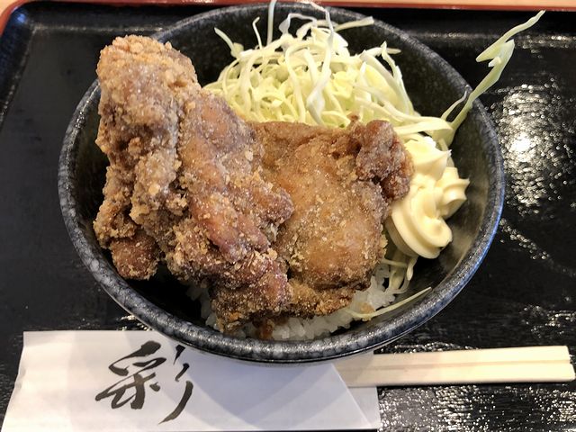 写真のとおり、ご飯の上には、カラッと揚がった大きめの唐揚げ2つと、せんキャベツとマヨネーズ。