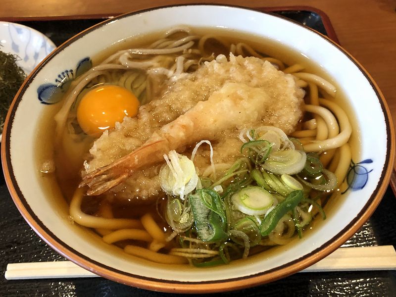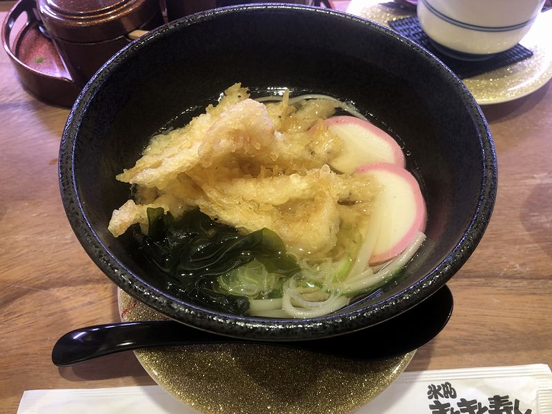 店内はわりと広く、注文は券売機で食券を買うスタイル。お伺いしたのが、閉店時間である午後9時のちょっと前だったせいか、天ぷら(海老天?)、かき揚げ、白えびの天ぷらといった、天ぷら系の品はすべて品切れランプが点灯。しからばキツネでもと思った時に目に入ったのが、今回いただいたこちらの品。