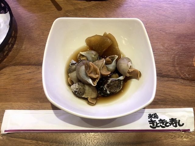 つまみその2は、バイ貝の旨煮。小振りなのが8つも入っていて、更に一緒に煮たと思しき大根も。