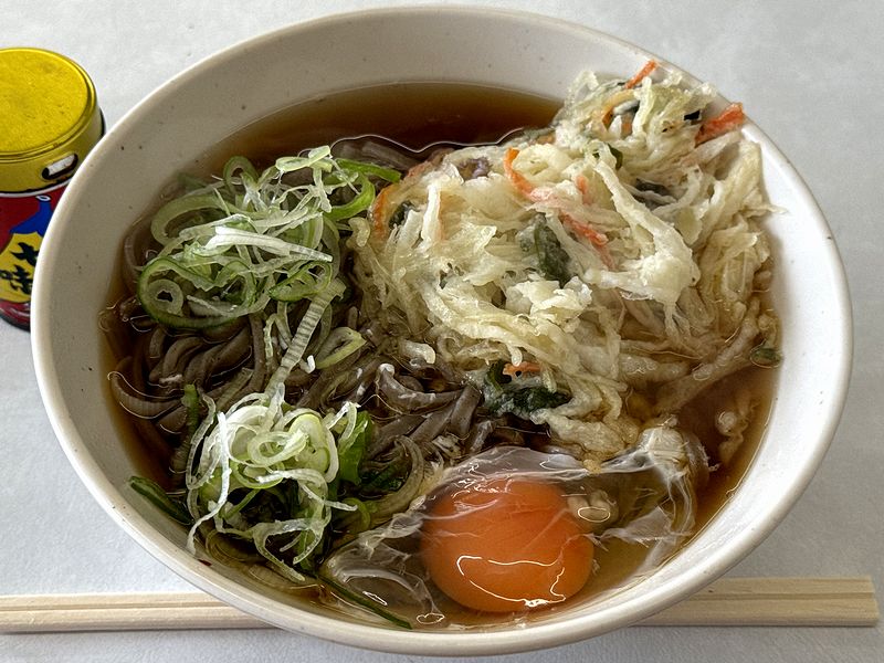 程なくして番号が呼ばれ取りに行った帰り、無料コーナーで天かすをソバの上にドサーっと。今回は、冷やしたぬきそば(当地の冷やし・ひたしの方でなく、関東圏で一般的な方)のように食べたかったので。