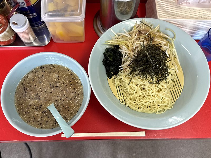 また付け汁は、酸味はほとんど感じられず、それよりもかえしの塩気と醤油っ気を強く感じるタイプ。そこに、つゆに入ったチャーシューや背脂、そしてゴマがアクセントを加える感じですが、個人的に酸味は、お酢を麺にかけて調節すればいいと思っているので、これはこれで。刻み海苔の風味も合っています。あと添えられたワカメも嬉しいですね。