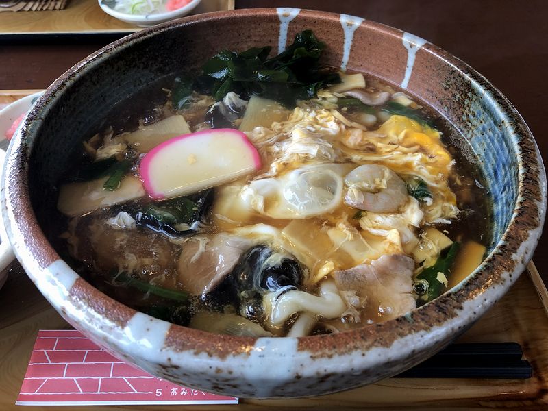 そして、ツユに入っていた具材は、豚肉、小エビ、キクラゲ、タケノコ、ホウレン草。それとトッピング的にワカメとカマボコ。ほんと、味と食感のバラエティ豊かで。