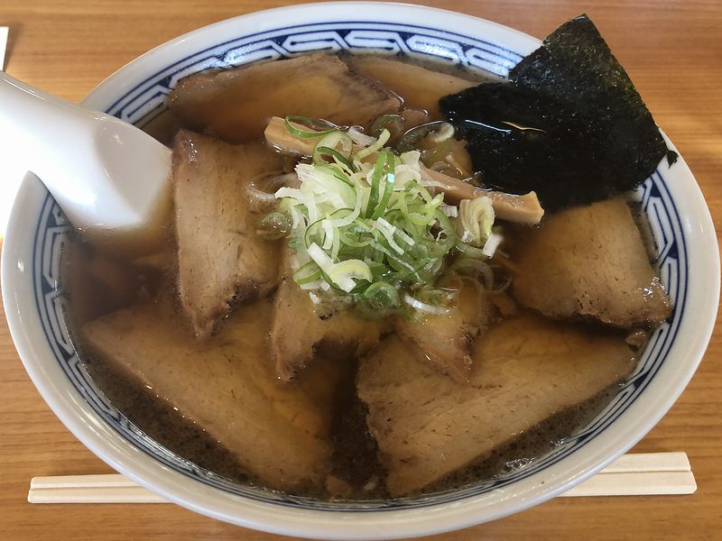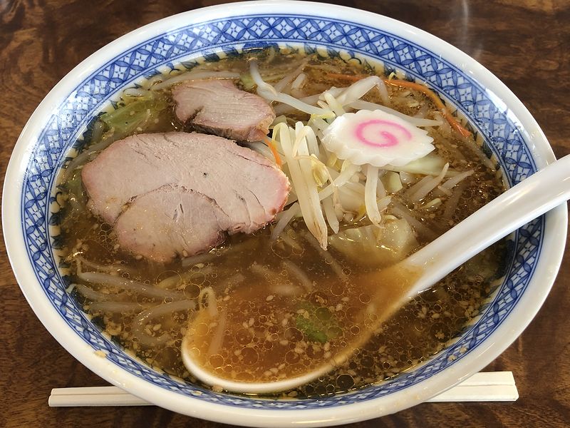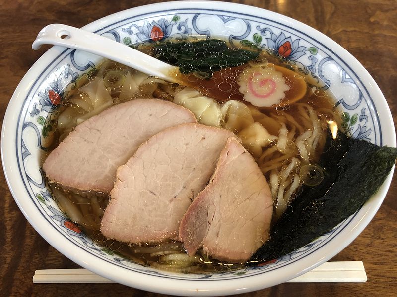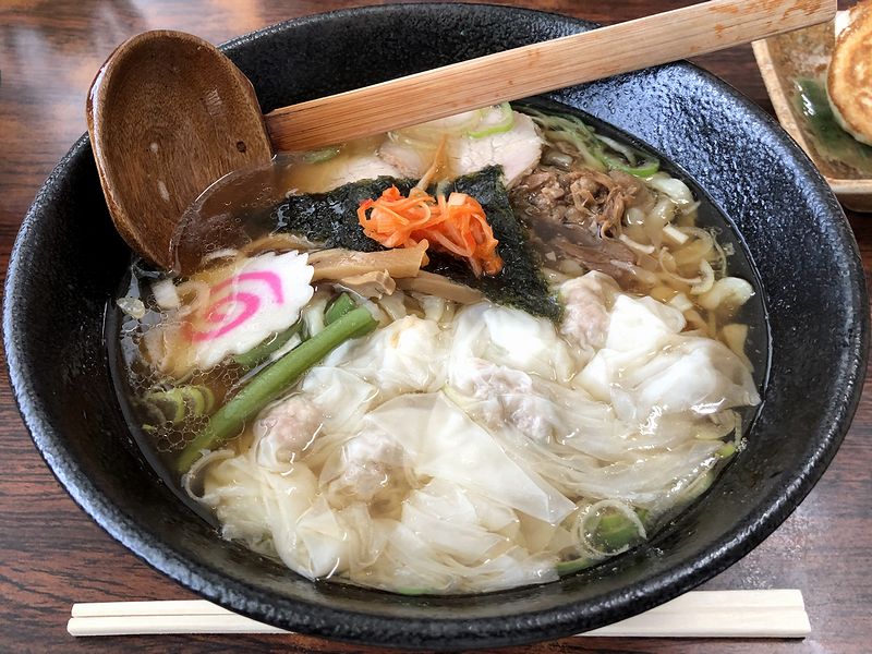 お店の前にクルマを停めて入店したところ、広めの店内は幸いなことに席が空いていて、すぐに座ることが。でもって卓上のお品書きを見たところ、白河の王道というか、中華そば、ワンタン麺、チャーシュー麺、チャーシューワンタン麺に加え、置いているところがわりと多い印象のごまタン麺(と、チャーシューごまタン麺)もラインナップ。あと、トッピングの餃子や味付半熟煮たまご、サイドメニューは餃子にチャーシュー丼という感じで。