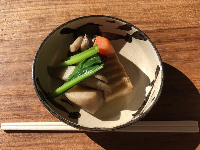 で、使われている野菜は、里芋、ゴボウ、人参とあしらいの青菜。厚揚げは柔らかい絹ごしで、きのこはヒラタケでしょうか?それらに程良い味加減のお出汁がよく染みて、もう。
