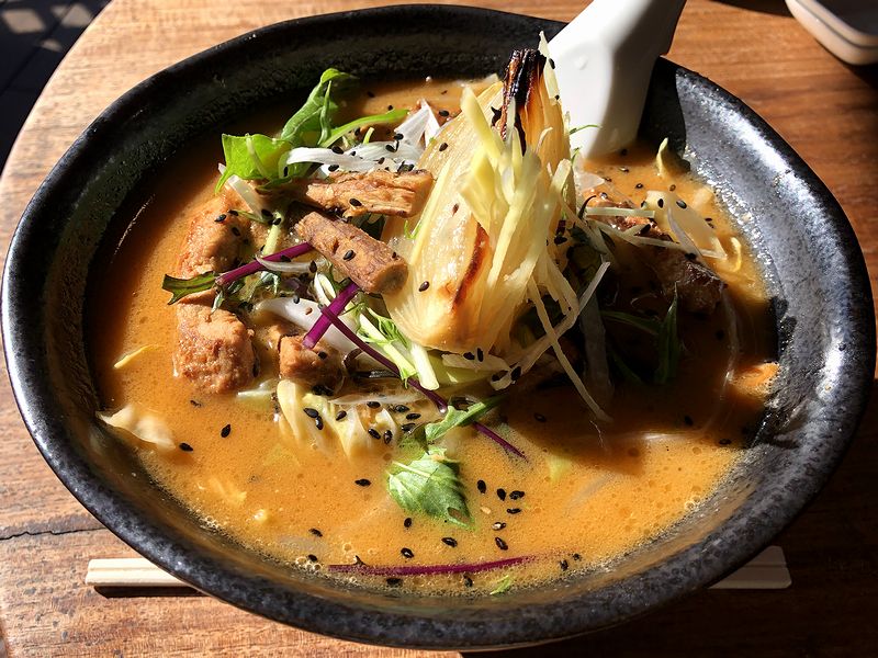 それと具ですが、見た目からしてインパクトあるのが、1/4に切ってローストされた玉ネギ。これが、甘味があってじつに良いですね。それと豚肉は味噌漬けでしょうか?ゴボウも印象的だし、他に自家農園で採れたと思しき野菜が沢山入ってました。