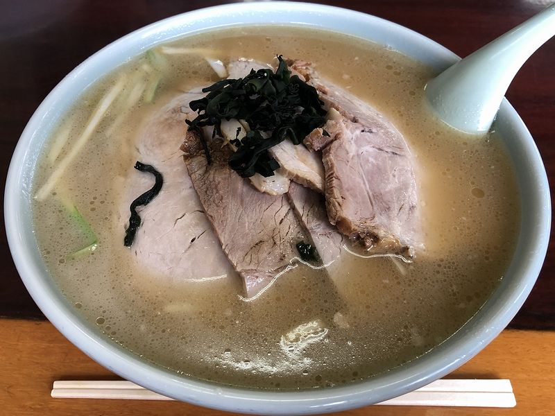 それで今回私がいただいたのが、醤油味のネギチャーシューメン。で、何度となくいただいているこちらのネギラーメン(チャーシューメン)ですが、今回のは珍しくタレが絡んだネギを混ぜる前から、スープにタレが溶け出したのか醤油色が。そのせいかはわかりませんが、味付けがこちらのお店の個人的平均値よりも濃く感じました。もっとも個人的には、これはアタリの部類に入るというか、ザキザキした食感のネギを良く混ぜてからいただけば、いつものライト豚骨出汁に、ビシっとした塩気が効いて、むしろ悪くない味わい。更に、普段は投入後あえて混ぜないニンニクも混ぜ込んでしまえば、ニンニクにより膨らんだ旨味に塩気が負けずに、これも。で、そんな濃い味のスープで啜る、茹で加減が丁度良いラーショ麺も、また。更には、「肉」味わってる感たっぷりのチャーシューにもそのスープが染み込んで塩味を増し、これまた。なんていうか、(記事公開はこんな冬場になってしまいましたが)このしょっぱさが有り難い、ほんと、夏場の味だなぁ、と。