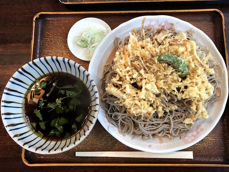 それで注文からそれほど待たずに登場した私の冷し天そばですが、まず見た目がかなり上品。細めのソバに載った大判なかき揚げは、見るからにクリスピーな揚げ上がりで、ツユには三つ葉があしらわれています。で、まずはソバから、最初は何も付けずにいってみたところ、若干しっとりした口当たりで太さは細めなれど、ツルツルと入るような感じではなく、歯応えは強くはないですが、香り・味共に蕎麦の存在感がしっかりとあるというか。次にツユに浸していってみれば、そのツユは、「冷やし」にしては味が濃いめ。出汁感もありますが、負けずに濃口醤油も効いていて、甘味もわりと感じられる味わい。そしてかき揚げは、当地の「冷し」で一般的なタマネギがメインのものとは違い、タネはかなり細めに切られたゴボウとニンジンがメイン。それに竹輪が合わさって、シシトウがあしらわれているのですが、これがまた悪くない組み合わせですね。それと食感は見た目どおりサクサク感というか、クリスプ感が強めで香ばしいですが、ツユとも良く馴染みます。そして最後は蕎麦湯でツユを割っていただけば、出汁の香りがより花開く感じ。元々のツユと温度はさほど変わらないはずなのに、ちょっと不思議です。