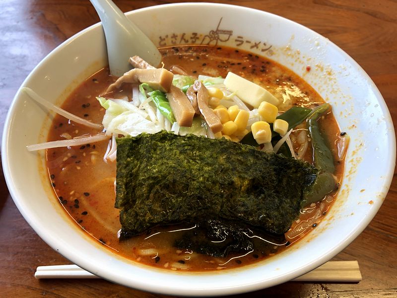 それで登場したら、バターが載ってない方のスープからいただいてみれば、ニンニクがバシっと効いて具の野菜と挽肉の旨味が味噌とスープと一体となった、ちょっと懐かしい感じのするこちらのお店のノーマルな味噌味に、唐辛子の風味と辛味を足した感じの味わいで、これもまた良いですね。ちなみに、辛さはピリ辛程度なので、極端に辛いものが駄目でなければ問題なくいただけるかと。それと麺は、こちらのお店でお馴染みのポニョシコっとした中太タイプ。そして具は、ノーマルな味噌ラーメンと同じ、スープと良く馴染んだ挽肉とキャベツとモヤシ、あとコーンにメンマに茎ワカメという組み合わせですが、辛味噌だとそこに海苔も入るのですね。で、辛味噌味と海苔、悪くない組み合わせに感じました。あと、追加したバターは間違いない相性というか、卑怯な旨さというか。