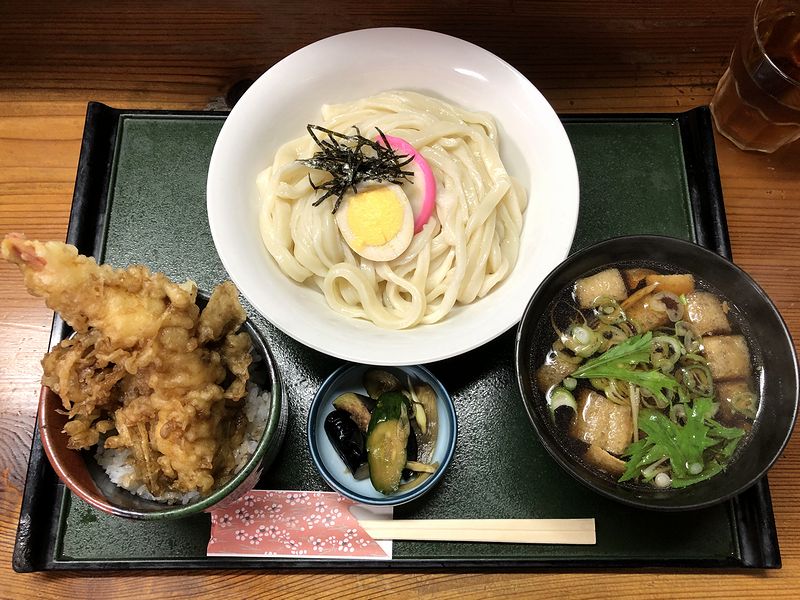 【本日のおすすめセットメニュー(とり肉とごぼうのつけ汁うどん+ミニえび天丼) 1100円】