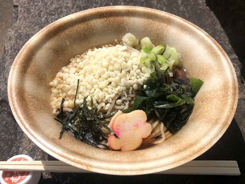 で、お品書きには暖かいうどん・そば(たぬき・きつね・山菜・とろろ昆布)に加えて、夏場らしく「冷し」のうどん・そば。で、この日はとても暑い日で、しかもいただく前、わりと長い距離をあるいたため大汗を書いた状態。本来なら暖かいもののほうが身体には良かったのかもしれませんが、とにかく身体を冷やしたかったので、3種類(たぬき・きつね・山菜)の冷しメニューから、たぬきそばをお願い。あまり待たずに手渡され、お店近くのテーブルが空いていなかったので、とりあえず椅子代わりに置かれている?大きな石の上に置いて写真撮影の後、いざ。