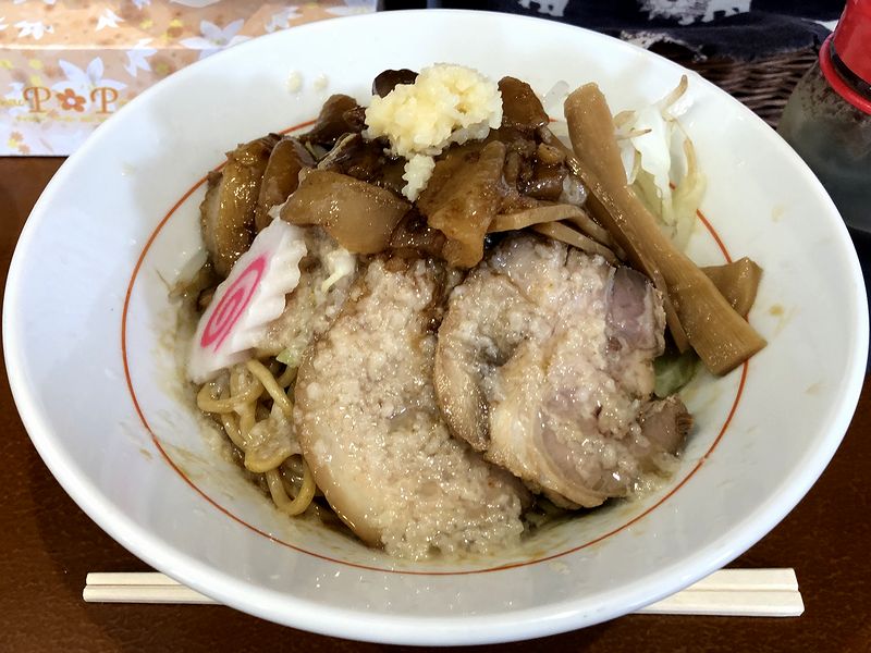 そんな気分の中で登場したジャンク油そばですが、とりあえず一通り混ぜてからいただけば、麺からは醤油のエッジがビンビンに効いた味わいが。ですがそれは混ぜ不足だったようで、混ぜるほどに、煮干しっぽい香りと共に「ジャンク」の由来たるたっぷりの背脂とニンニクとの一体感が増してきて、これが、もう。また太めの縮れ麺は、ドゥルンドゥルンの口当たりで、油そばゆえ茹でっぱなしと思われるのですが、それでもちゃんと噛み応えが有り、元々の麺自体の味が良いので油そばでたまに出くわす粉っぽい風味がないのも良いですね。そして具のバラチャーシューは柔らかめなので、よく混ぜると自然と麺に絡む感じ。茹で野菜が時々サッパリ感を加えてくれ、メンマは箸休めという感じで。それと、一緒に出してくださるラー油を途中から投入すると、辛味もそうですが、ゴマ油の良い香りが加わって、これも、また。最後はお酢を加えて楽しみました。