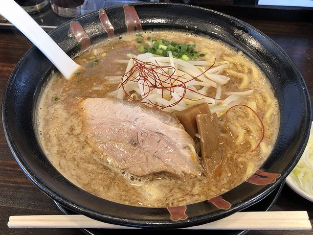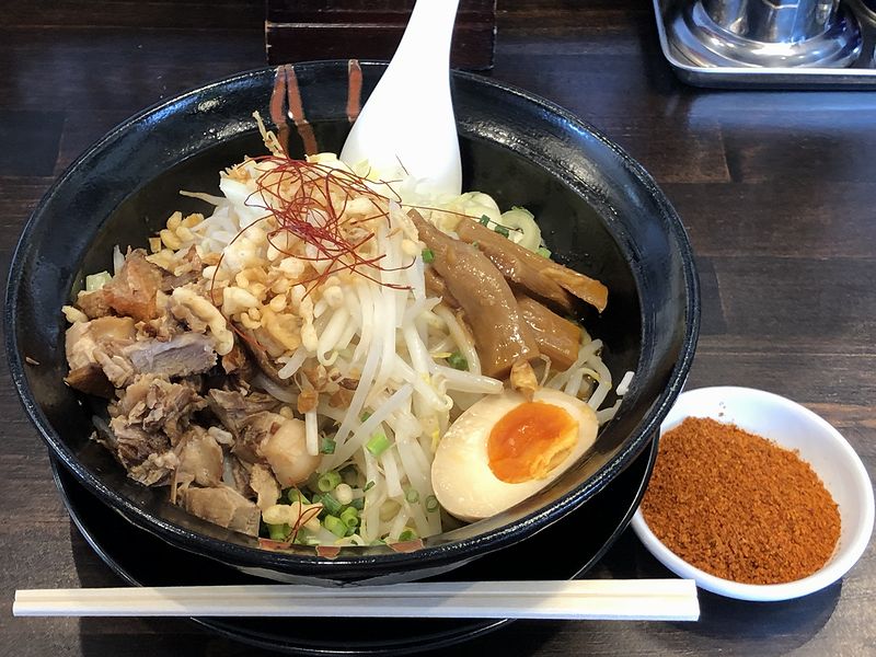 それで今回は看板の味噌ラーメンではなく、まぜそばに辛魚粉を追加して。注文時、味噌味か醤油味か尋ねられたのですが、味噌味は以前いただいた(ていうか、味噌味レギュラー化した?)事があるので醤油味で。で、登場したら、最初は辛魚粉無しで全体を良く混ぜ混ぜ。その後に麺を啜れば、タレがとっても良い塩梅で、そのタレが絡む麺は、まぜそば独特のヌルっと感はあるものの、チュルムチモチっとした食感が何ともよく、麺自体味もいいですね。そこに具の、ホロトロっとしたチャーシューが崩れ気味となってよく馴染み、それと糸唐辛子の香りに、2種類のネギの風味や、シャキシャキのモヤシなどの具材も良い感じで絡み、これが、もう。それと辛魚粉は今回、途中から掛けただけであえて混ぜずにグラデーションを楽しむ感じで使ってみたところ、これがまた。名前のとおり、節系魚粉の風味・旨味に加えて、唐辛子の香りと辛味がしっかりと加わり、たいそうパンチのある味になりました。