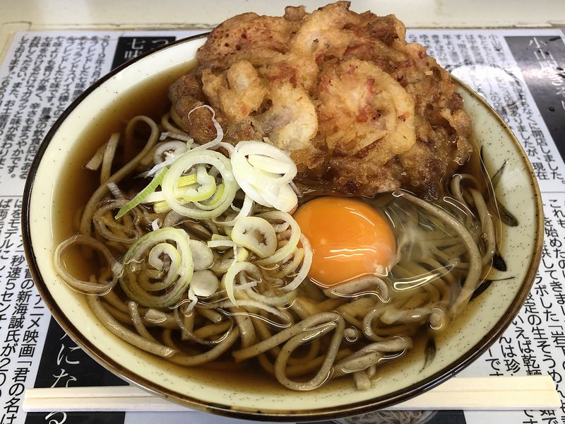 それで今回は、個人的定番になっている天玉そばを。券売機で購入した食券を提出すれば、鮮やかな調理でパっと登場したのですが、早速ツユからいってみたところ、甘さ控えめの醤油っ気、味付け共に濃い目のキリっとした味わいが、また。こちらで温かいそばは久しぶりでしたが、トラディショナルな味わいがやっぱり良いですね。またソバは、このテのお店では定番かつ、個人的に大好きな茹で麺。フワとした口当たりに、モチプリっとした歯切れ。これぞ茹で麺という食感なのですが、わりと香りもあっていい感じです。そして具のかき揚げは、サクカリっとした軽めの食感ですが、ツユの馴染みは良く、それと小海老がとても香ばしいですね。