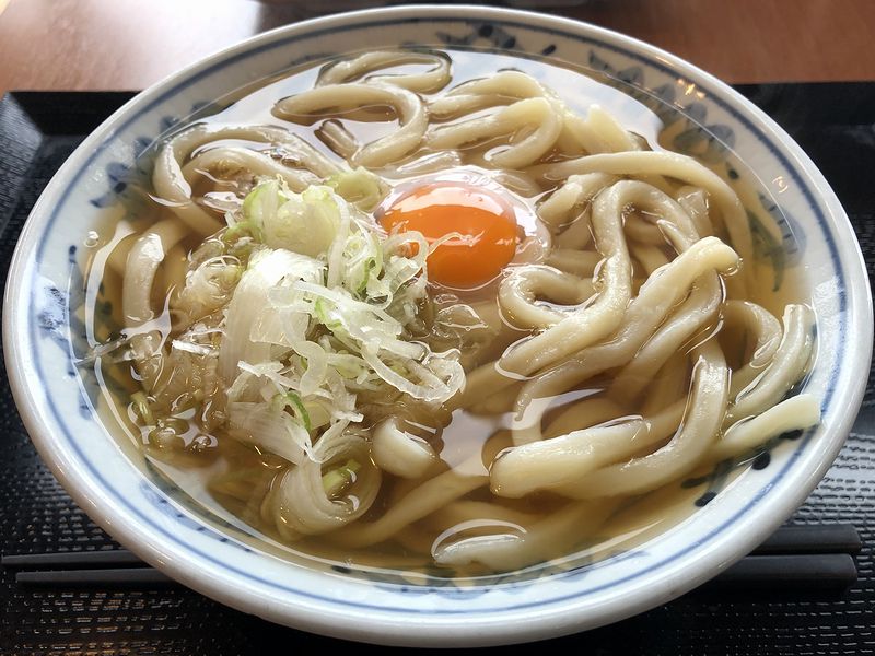 で、この日は梅雨寒という感じの気温だったので温かいうどんが食べたくなり、3回連続での月見と相成った次第。それで早速ツユからいってみところ、今日のは出汁感が結構あったというか、特に節系の香りが良いですね。また味付けも、塩っぱい物好きの個人的にはもっと濃くても良いのですが、一般的には丁度良い塩梅じゃないでしょうか。そしてウドンは、今日のはタイミングのせいか、前回わりと感動した食感よりもちょっとスイトンっぽい感じ。この日はメチャクチャ湿度か高かったので、そのせいもあるんですかね。もっとも個人的には、当地らしい気取らない食感ということで、これはこれで好きなんですが。