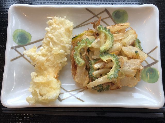 それと今回一緒にいただいた天ぷらはこの2種類。で、まず烏賊天は、間違いないところ。そして本日のおすすめは、タマネギをベースにゴーヤとじゃこという感じだったのですが、ゴーヤはしっかり苦くて、じゃこがしっかり香るという感じで。前述の湿度のせいか、ちょっとクタッとなってしまっていたのですが、揚げたてならどんな感じだったのでしょうか。