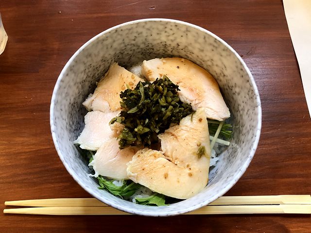 こちらは、一緒にいただいた品。で、ラーメンと違う塩味の鶏チャーシューが載っていたのですが、こちらも醤油味同様、しっとりジューシーな食感が良いですね。そこに、いい塩梅のタレと、高菜漬け的漬物と水菜がアクセントを添えて、という感じで。それとびっくりしたのはご飯。どんなお米を使っているのかわからないのですが、良い意味でとても甘く感じました。