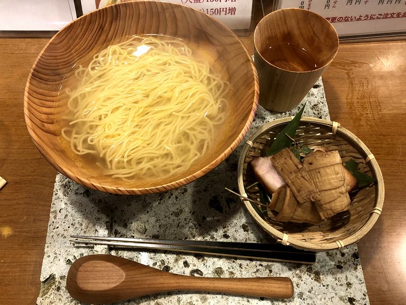 それで無事いただくことができたお目当ての品が、美食に関する歴史的名著の邦題「美味礼讃」(余談ですがこの邦題、原題の直訳とは全く違うのですが、もの凄く良い題だと思います。)が付けられたこちらの品。大谷石のプレートと箸置きの上に、杉の木の丼に入ったラーメン、笹が敷かれた竹籠に入ったメンマとチャーシュー、檜葉(ヒバ)のコップに入ったお冷という、凝った什器で登場。で、提供された際に奥様から、まずは檜葉のコップに入ったお冷で木の香を感じてからラーメンを、との説明が。