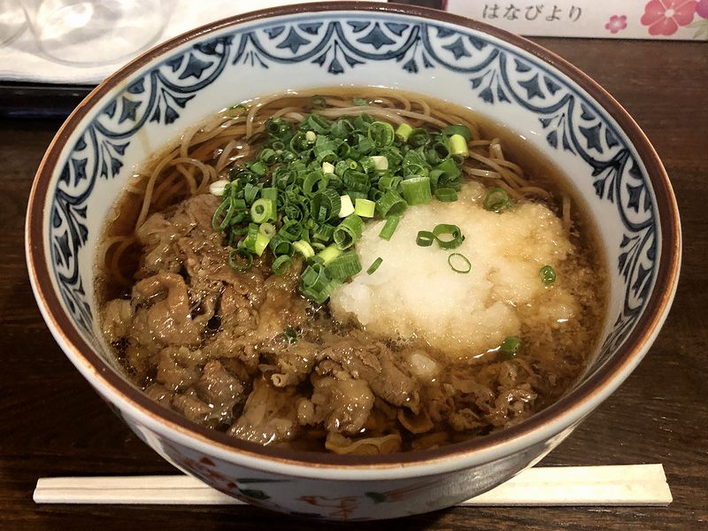 それで今回はいつもの桜えびのそばではなく、牛肉と大根おろしが入った牛肉みぞれソバを。まずはツユからいってみると、いつもの味わいというか出汁感そこそこで、醤油っ気、塩気、甘味のバランス良い味わい。ですが今回はそこに、具の牛肉からこっくりした甘味と脂のコクが加わり、更に大根おろしのちょっとピリッとサッパリした味が加わる事によって、ただの肉そばとは違う味になっていますね。また細めのソバは、歯応えあって啜り心地がツルっツル。それと甘じょっぱい味付けの牛肉は、量的に意外と食べ応えがありました。