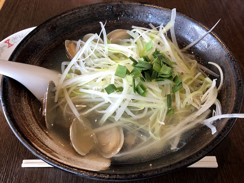 程なくして登場したら、まずはスープからいってみると、ベースとなる動物系メイン出汁に、大粒なアサリから出た旨味がジョワジョワっと。個人的に貝出汁だけだと攻撃的旨味だとは思うのですが、ベースと合わさることによって滋味深い味わいになり、そこに塩ダレがマッチして、もう。また麺は、最初は歯応え有るけどわりとすぐに馴染んでくる印象。それと共に口に入ってくるのが、細(ほそ)切りされた白ネギ。これが歯応え有るというか、ザキザキした食感。ネギが有った方が風味的にいいかもしれないのですが、次は無しでも食べてみたい気もします。そして殻付きのアサリは、大粒でふっくら。数も入っていて、食べ応えがありました。