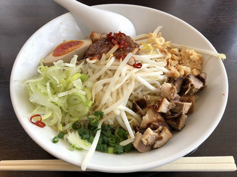で、登場したら、まずはよく全体を混ぜから太い麺を啜れば、ムっチモチトゥルっとした食感に味噌ダレが絡んで、これが、もう。その味噌だれ、混ぜる前は量が少なめだと感じるも、麺と絡むと、コクのある味噌に赤唐辛子の辛味が切れ味を加えて丁度いい味加減となりますね。そして具は、角切りのチャーシューはホロっと麺に絡みやすく、シャキシャキの茹でもやしのサッパリ感、ザクっとした歯応えのフライドオニオンの香ばしさ、2種類のネギのツンとした風味も良く合っています。それと、半個載る味玉は箸休めに丁度良く。あと、店頭のガチャガチャ4等は辛ネギに替えてもらったのですが、それでの味変も良く、最後はお酢を入れても合うという。多分初めていただきましたが、味噌味の混ぜそば、良いじゃないですか!