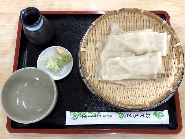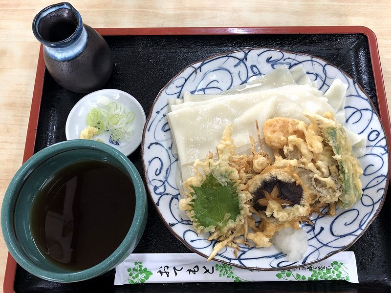 で、こちらのお店にお伺いするのは3度目となるのですが、最初のひたし、次のラーメンと来て、今回はこちらのお店の名物「おしらじ」をいってみることに。ちなみにその「おしらじ」。前回お伺いした時に相方がいただいていましたが、このお店がある矢板市の山の方にある、幻の滝と言われる「おしらじの滝」からその名前を取った、幅広・極薄のウドンのことで、北関東の一部地域の人たちには「ひもかわうどん」に似たものと言えばわかっていただけるかもしれません。