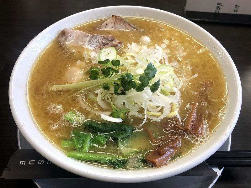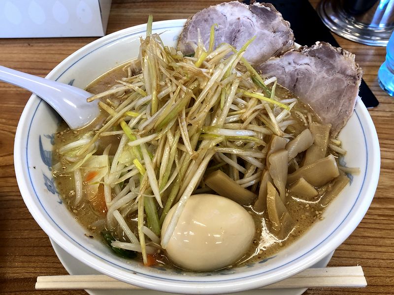 それで注文は、これまた何も考えないでこの品に。あ、「どうせなら初めて注文する品を」くらいは考えたかもしれませんが、いわゆる「全部入り」で、野菜、チャーシュー、味付け玉子、メンマ、ネギが載った豪華版です。