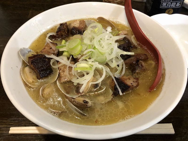 それで今回は、個人的定番ではなく、未食で気になっていた品の中からこちらの品を。早速スープからいってみたところ、一口目から、旨味がとても濃厚。重層的な元々のコク旨スープに、具のアサリからコハク酸的強い旨味が加わって、もう、旨味のオンパレードという感じ。更にそこに、チャーシューの香ばしさや薬味的白ネギの爽快な刺激もアクセントになって、たまらない味わいになっていますね。また麺は、太めの緩く縮れたタイプで、プリモチシコっとした食感。スープには負けてないというか、これはこれで小麦の主張や、最後まで食感がタレないのも良かったです。そしてメインの具である、たっぷりのアサリと角切りのチャーシューは、どちらも存在感を放ち、白ネギの刺激が全体を引き締めていました。