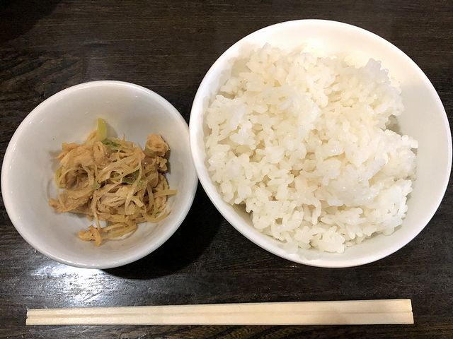 で、そんなスープだから、当然ライスとの相性も良し。ただ、丼の底にはどうしたってアサリの殻の欠片が沈むので、汁をライスに掛けて食べるのが吉かと。それと、ライスに付いていた鶏肉とネギをピリ辛に和えたものが、良い箸休めになりました。