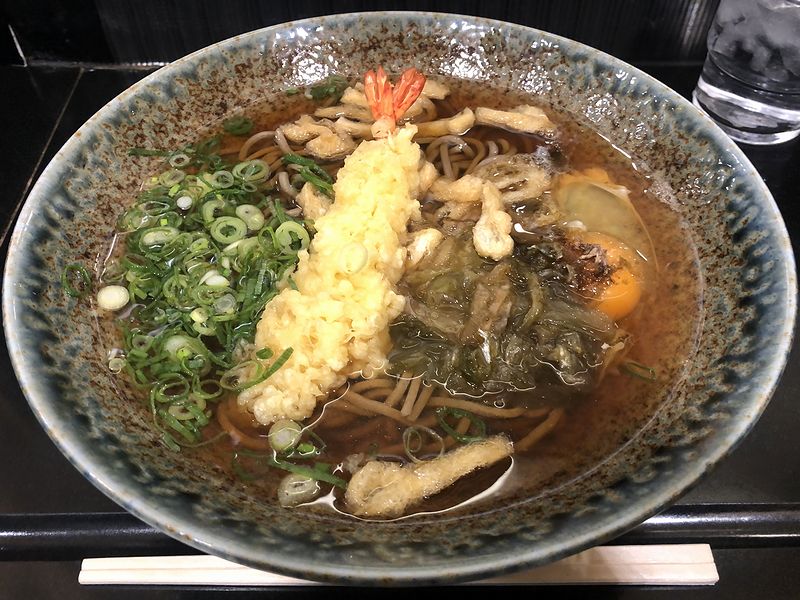 それで今回いただいたのが、名前だけ見て食券を買った「スペシャルそば」。スペシャルとあって、通常のものよりも一回り大きい丼に、具がエビ天、生卵、刻み揚げ、とろろ昆布と4種類も載っていました。で、早速ツユからいってみたところ、店内でちゃんと出汁を取っているだけあって、風味と旨味がしっかりと。また見た目は当地にしては醤油色が濃い目な気がしたのですが、普段から濃口醤油まみれの北関東人的にはそんなに来ず、味付けは、甘さ控えめなお店が多い(と個人的に感じる)当地の中にあっては若干甘味が立っているように感じますが、この辺は感じ方に個人差や体調も関係するので。あと個人的に大事な塩気は、必要充分で、生卵にも負けません。そして色黒ソバは、王道の茹で麺。ツルヤワ系な食感ですが、多少の歯応えもあって、個人的には好ましいタイプ。それと具の海老天は、衣がツユと馴染みづらい=最後までしっかり残るタイプ。もっとも、エビ天をパクパク食べてしまったとしても、気が付くと沈んでいる刻み揚げが、最後まで面倒を見てくれますが。