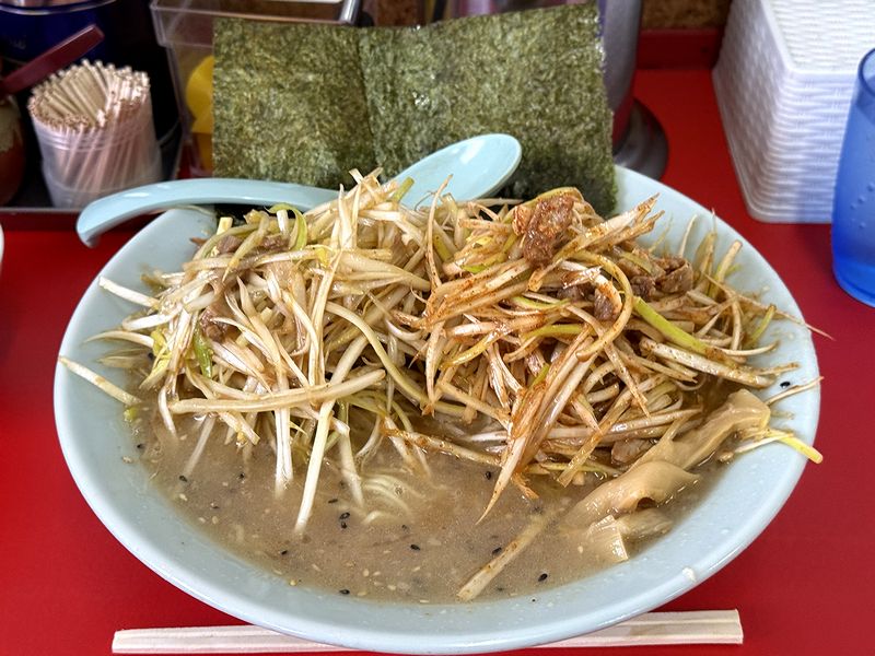 で、まずは味見というか、あえてそれらのネギは混ぜずにスープをいってみると、味噌ダレが結構な濃さ。開店当初より濃く感じるのは、決して体調の所為だけではないと思います。更にネギを混ぜると、ガツーンっ!とくる濃さに。実は事前に、ノーマルのネギと辛ネギ両方とも、半量くらいを半ライスの上に移植したものの、ノーマルなネギのタレと、辛ネギは豆板醤ベースでしょうか?それらの塩気に加え、唐辛子の鋭い辛味も加わるので、かなりのインパクトですね。なのでそれとバランスを取るために、相当な量のおろしニンニクを投下しましたが、ほんと、休日で良かったというか。(もっとも、翌日の方が、体臭的にはキツくなりますが。)