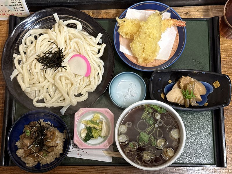 【本日のおすすめセットメニュー えびとはぜの天ぷらうどん(温つけ汁)+ミニあさりごはん+たけのことふきの煮物(うどん大盛) 1,400円】