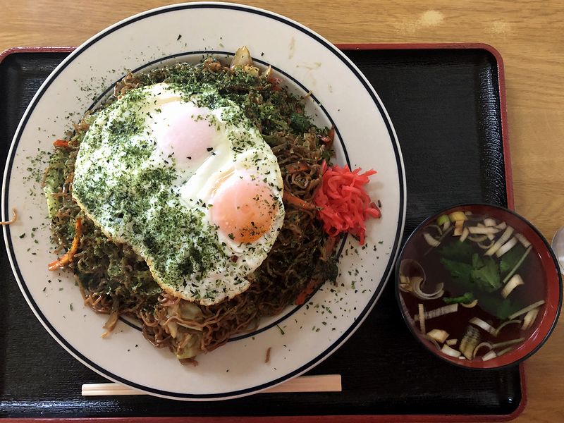 で、待つこと少々で搭乗した件の品。パっと見、お皿が大きいというか、お皿の直径は下のお盆よりも大きいじゃありませんか。そしてそこに、こんもりと盛り付けられた焼きそば。また100円増しだった目玉焼きのせは、卵2個分と良心的ですね。