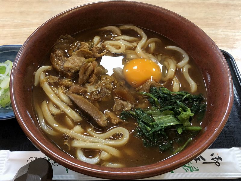 で、早速ツユからいってみたのですが、見た目どおり八丁味噌的豆味噌味というか赤だし味というか。塩気は濃いめですが濃すぎず、煮込まれたことによる角の取れたまろやかさや、一緒に煮込まれている具の旨味も感じます。またウドンは冷凍でしょうか?それっぽいプリムチっとした食感。そして具は、クタクタになるまで煮込まれた、鶏肉、白菜、油揚げ、シイタケ。それで途中から、生卵を割って味変。当たり前ですが、まろやかさが増してこれはこれで。