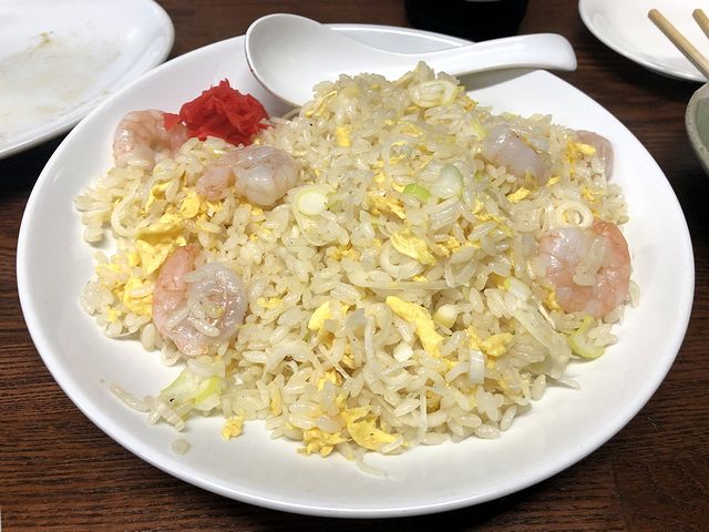 餃子とビールという組み合わせを楽しんでいると登場したのが、こちらの炒飯。パラっパラとしたご飯の仕上がりが本格中華料理店っぽいのですが、そのご飯と一緒に炒められている具は、プリっとした剥きエビの他、卵、長ネギとシンプル。味付けも塩コショウくらいだと思うのですが、それと共に相当濃い旨味を感じました。