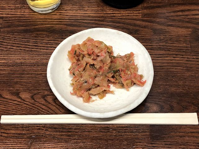そのビールと共にまずいただくのは、突き出し的にすぐ出てくるだろうと注文しておいたこちらの品。ザーサイ自体の塩気は強くなく、そのコリコリとした食感に、山海ぶしというかかつお梅的味わいの和え衣が絡んで、これがなかなかの珍味。これから来るであろう料理との相性も良さそうで良かったなぁ、と。