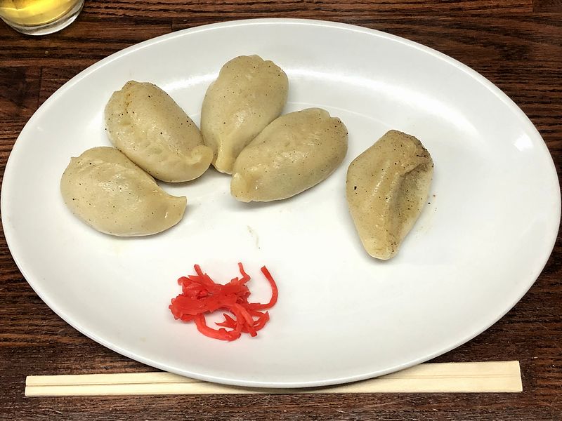 宿からほど近かったそのお店には、午後6時の少し前に到着したところ、20人まではいかなかったと思いますが、結構な長さの行列ができていました。で、その最後部に付いて並ぶこと暫し。列の前方には、地元の人っぽい家族連れもいるにはいたのですが、大半が観光客というか一見さんっぽい人達のよう。そして不思議なのは、私の後ろに並ぶ人がなかなか現れなかったこと。それが何故かと判ったのが、並び始めて30分以上経った時に、ようやく私の後ろに並ぶ人(いかにも観光客といった感じのグループ)が出来て暫く経った時のこと。お店の方が注文を取りに来たのですが、その際、お店の一番のウリであろう餃子が、残り僅か(具体的に残り何食)という話が聞こえてきました。こちらのお店は、提供する餃子の食数を絞って営業されているようで、どおりで、地元の人は時間帯と行列の長さから判断して「餃子はもう食べられない」という感じで行列には並ばないようだと、一人合点した次第で。