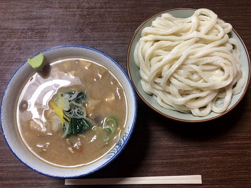 そのお目当ての品とは、冬季(11~2月)限定メニューとなる「けんちん」。今回は、それをひたしうどんとしていただきます。で、まだ湯気を立てているウドンを、別の器に入ったけんちん汁に浸けていただけば、これが、もう。まずはけんちん汁ですが、味噌ベースの味付けがバッチリ。旨味も十分で、麺を食べさせるしっかりとした味になっています。またその具は豚肉も入り、豚汁と言っても差し支えないほど。他の具はメインの木綿豆腐の他、コンニャク、ブナシメジ、里芋、ゴボウ、ニンジン、白菜に、後入れのホウレン草。あと薬味として白ネギと柚子が入っているのですが、けんちん汁(いや豚汁か?)には柚子の香りがよく合いますね。そして温かいウドンはモッチリとした噛み心地。正直なところ若干すいとんを思い起こさせる味と食感なのですが、逆にこのツユにはそこが合っているます。それと、けんちん汁(いや豚(ry)が入った器の縁にワサビが付いていたのですが、ネタ的にウドンに付けて試したところ、これはこれで悪くなかったというか、汁に溶かそうとは思わないものの、こういう使い方ならアリだな、と。