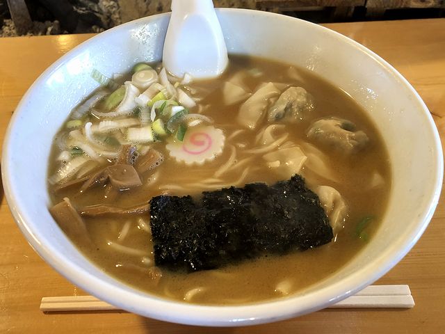 それで私は、最初、たんめんでもいただくつもりでいたのですが、注文時に店員さんから、毎年冬恒例の海老ワンタンが始まっていると聞いたので、急遽そちらに変更した次第。それでサービスの大根甘酢漬けをつまみながら待つこと少々で登場したのですが、早速スープからいただいたところ、!!!こちらのお店のスープって、わりと振り幅が大きいという認識なのですが、今回のは豚骨出汁の濃さとまろやかさ、そして味付けの魚介+醤油の効かせ具合が、自分史上最高クラスの仕上がり。ほんと、わざわざ宇都宮まで来た甲斐があったというものです。また麺は、いつものツルツル食感の、細ストレートタイプ。スープが美味いと麺までいつも以上に美味しく感じられますね。そして海老ワンタンは、プリっプリの食感と、海老+肉の味わいが、これがまた。粗く切られたネギ、しっかり味付けされたメンマ、あと海苔も当然良く合っています。
