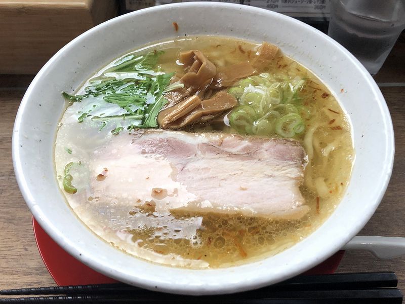 そんなわけでラーメンは塩味をチョイス。早速スープからいってみたのですが、動物系メイン?に感じる出汁の旨味も塩気も必要充分というか、スっと入るけど滋味充分という感じで。そこに、揚げエシャロットでしょうか?香ばしさが絶妙ながアクセントになっていますね。また麺は、適度な太さと薄さで、表面ツルっ噛むとシコっとした、佐野らしい手打ち麺のなかでも相当ハイレベルに感じるもの。そして具のチャーシューは、柔らかに食感と、素材の味がよくわかり、またどの味のラーメンでも邪魔しないて合いそうな薄めの味付けが良いですね。あとメンマは、甘めの味付けがラーメンの中で変化を付けててこれまた良い感じでした。