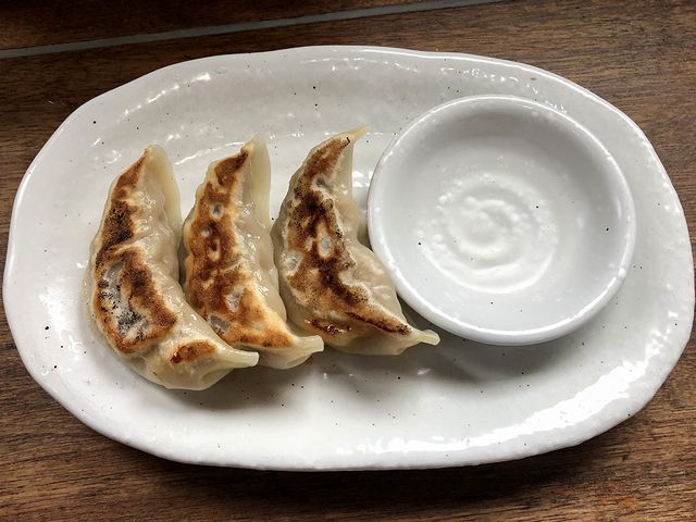一緒にいただく餃子は、ノーマルなこちらをチョイス。佐野らしい大きさですね。で、包んでから少々時間が経っていたかもしれないのですが、名前の通りとってもジューシー。中の餡は味付けがしっかりしていて。お酢とラー油だけでもでいい感じでした。