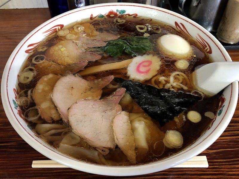 で、早速スープからいってみたところ、前回塩ワンタンメンをいただいた時に感じた鶏出汁の濃さよりは、鶏出汁、鶏油に濃口醤油がバシっと効いたバランスの良い白河のラーメンといった味わいが印象的。そこに合わせる麺は、相変わらずヌクヌクした食感が絶品の手打ち麺で、冷し中華の時のように〆られて歯応えマシマシになったこちらの麺も旨いのですが、スープに浸かったことによって適度に柔らかくなり、また食べ進むにつれスープと馴染んでいく味わいは、何時まででも啜っていたい幸せ。そして今回の具は、スモーキーで歯応えのミシっとしたチャーシュー、白河系にしては餡の大きなワンタンなどに加え、ブランド卵本来の味がよく分かる塩味の茹で卵も加えたものだから本当に豪華。それらと麺を一緒に口にいれればさらなる幸せが味わえます。