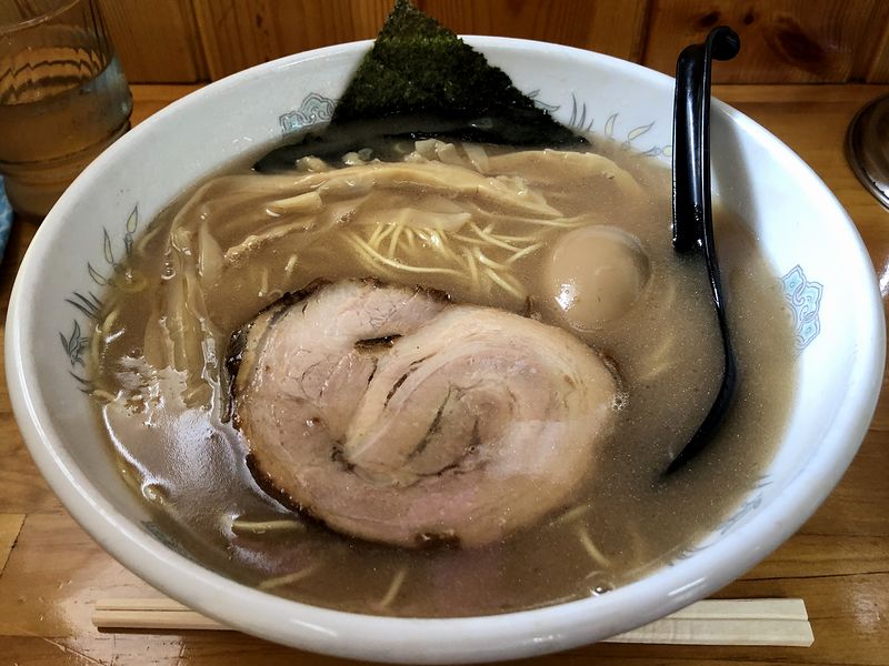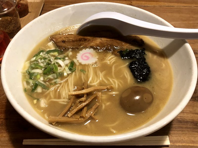 それでいただいたのは、メニュー変更のお知らせの中で、10月から不定期販売になる旨が書いてあったこちらの品。まずはスープからいってみたところ、口当たりというか濃度的にはサラっとしてるけど、豚骨のしっかりとしたコクにコッテリとした油感もあって、味付けは濃口醤油ベースでしょうか?ですが濃すぎずいい塩梅ですね。また麺は、低加水っぽいパツっとした食感の細麺。固めの茹であがりが、このスープと良く合っています。そして具は、厚めにスライスされたホロトロ食感のバラチャーシューや、シャクシャクとした食感が良い穂先メンマ共々控えめな味付けで、素材の味が良くわかる且つラーメンのバランスを崩さずに良い感じ。それは追加した那須御養卵を使用しているという味付け玉子も同様で、ゼリー状とトロっの中間くらいという絶妙に火が通された黄身と相まって、濃厚な卵の味が楽しめました。